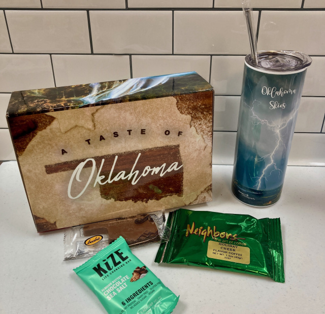 The gift will also include Made in Oklahoma products such as a KIZE protein bar, an Oklahoma-shaped chocolate bar, and one bag of coffee which makes a full pot. Made in Oklahoma coffee. Makes excellent Iced Coffee too---Add three bags to one pot. Refrigerate and then pour over ice and enjoy! All food products are made in Oklahoma. The Skinny tumbler is printed at Expressly Gifts.